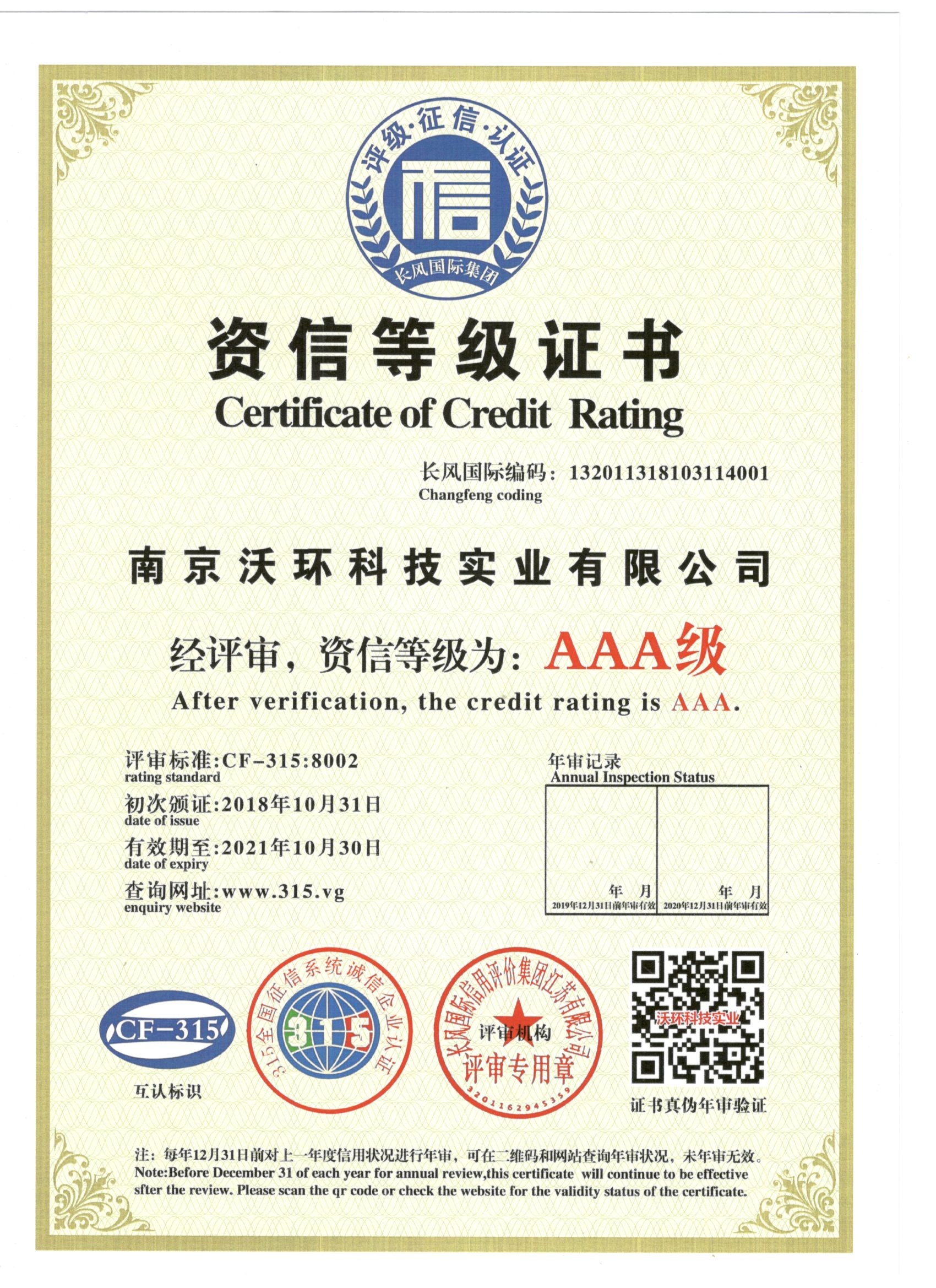 熱烈祝賀南京沃環(huán)公司被專業(yè)評審機構-長風國際集團評為AAA級資信等級